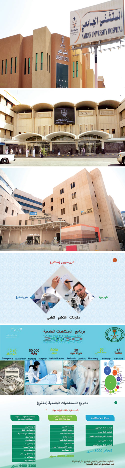 الأول، مشكلة توفر المستشفيات الجامعية لأغلب الجامعات (لا يوجد سوى ستة مستشفيات جامعية من 26 مستشفى نحن بحاجة إليها) وهي المعنية بالتدريب، في مختلف المناطق. بدأت جامعات المناطق وضمن خطط تأسيسها إنشاء مستشفيات جامعية ولكن نظراً لظروف ليس المجال شرحها، تعثر إنشاء أو إكمال إنشاء تلك المستشفيات، وبعضها بدئ في تأسيسه منذ أكثر من عشر سنوات ولم يكتمل.