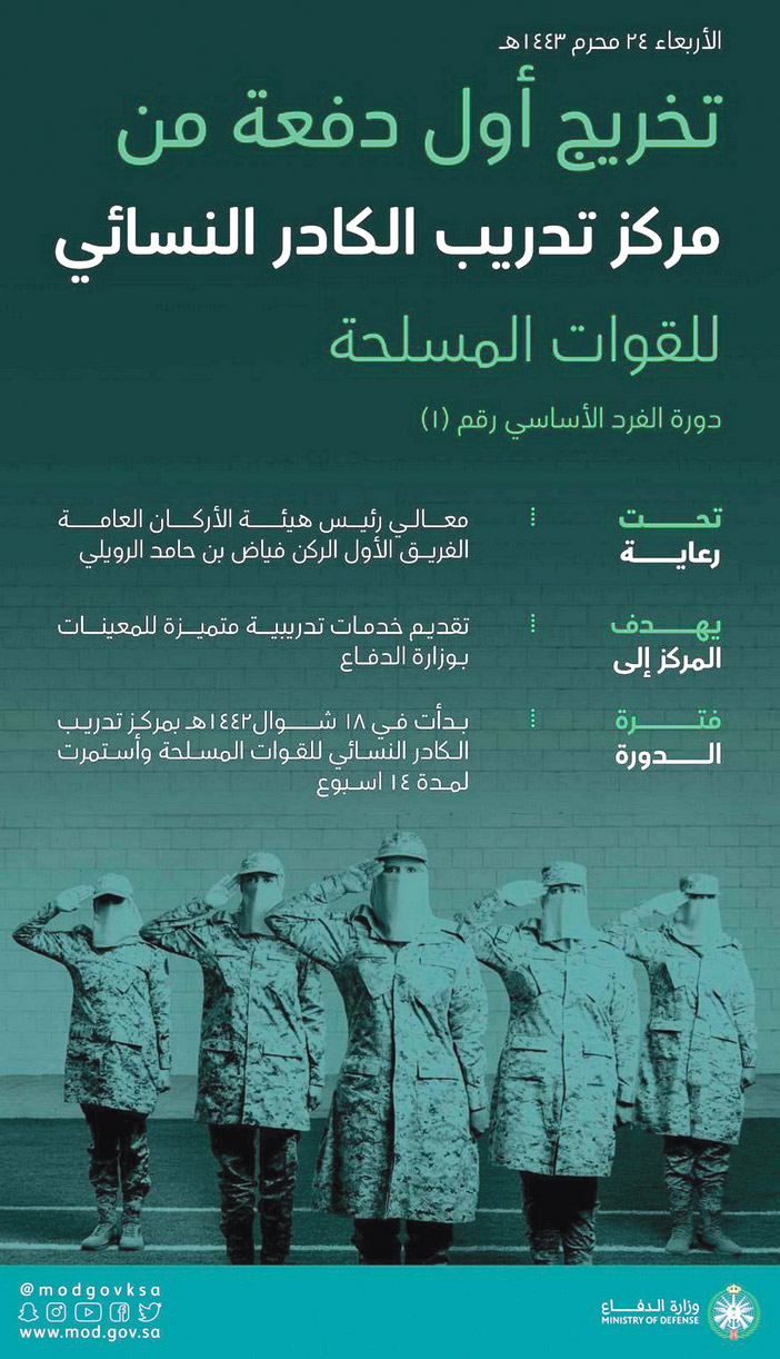 رعى معالي رئيس هيئة الأركان العامة الفريق الأول الركن فياض بن حامد الرويلي أمس حفل تخريج أول دفعة من مركز تدريب الكادر النسائي للقوات المسلحة بعد إتمامهن دورة الفرد الأساسي في المركز. وبدأ الحفل بآيات من القرآن الكريم، ثم ألقى رئيس هيئة تعليم وتدريب القوات المسلحة اللواء الركن عادل بن محمد البلوي كلمةً أكّد فيها أن المركز يهدف إلى تقديم خدمات تدريبية مميزة للمعينات بوزارة الدفاع بكفاءة واحترافية في المجالات الوظيفية التي تحتاجها الوزارة. وأضاف أن للمركز رسالة مهمة وهي توفير برامج ومناهج تدريبية متميزة وبيئة تعليمية مثالية وفقاً لمقاييس عالمية للجودة تلبي احتياجات القوات المسلحة من الكادر النسائي بهدف الوصول إلى أداء أفضل يساعد على تحقيق أهداف الوزارة مستقبلاً. بعد ذلك ألقى الرئيس رقباء سليمان بن مسعود المالكي قائد مركز تدريب الكادر النسائي للقوات المسلحة المكلف كلمة بهذه المناسبة. ثم تقدم مساعد قائد مركز تدريب الكادر النسائي للقوات المسلحة الرئيس رقباء هادي بن مطر العنزي ليلقي على الخريجات القسم لتأديته، بعدها أعلنت النتائج وأسماء المتفوقين والفائزين بالجوائز. وفي ختام الحفل، شكر معالي رئيس هيئة الأركان العامة الزملاء القائمين على المركز والزميلات العاملات بالمركز على مايقدمونه من أعمال متميزة دعماً لمهمة المركز. تجدر الإشارة إلى أن الدورة بدأت في 18 من شوال 1442هـ بمركز تدريب الكادر النسائي للقوات المسلحة واستمرت 14 أسبوعًا. حضر الحفل مدير الأركان المشتركة للقوات المسلحة اللواء الطيار الركن حامد بن رافع العمري، وعدد من كبار ضباط القوات المسلحة.