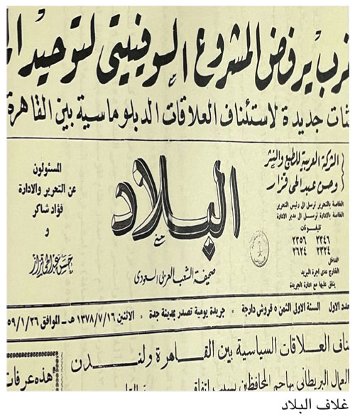 في 16 رجب 1378هـ الموافق 26 يناير 1959م صدر العدد الأول من جريدة البلاد، بعد اندماج جريدة (البلاد السعودية) مع جريدة (عرفات)، وقد أضاعت فترة من حياتها الحافلة بالأحداث السياسية والثقافية، إذ إن بداية صدورها بالعدد واحد يعطي القارئ الجديد - الذي لم يواكب مراحلها السابقة فكرة غير واضحة، وكأنه يلغي مرحلة مهمة من حياتها من صوت الحجاز إلى البلاد السعودية، من سنة 1350هـ إلى 1378هـ.