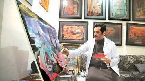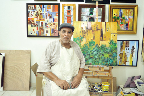 وأن حبه للوطن تجسّد في كل لوحاته.. وأنه يعتبر نفسه أنه «وطني في الشكل والمضمون».. في مناظر الأرض والسماء.. في الفضاء والصحراء.. في خضرة النخيل.. وزرقة السماء.. وفي اللون والملمس.