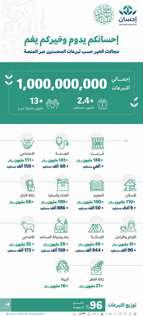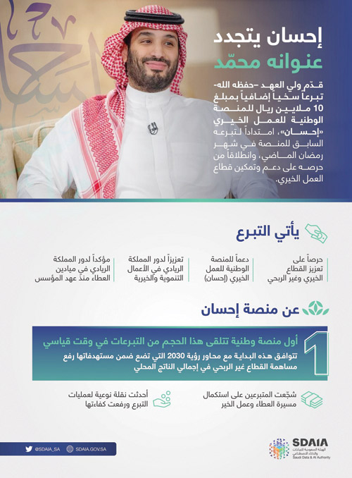 قدّم صاحب السمو الملكي الأمير محمد بن سلمان بن عبدالعزيز آل سعود ولي العهد نائب رئيس مجلس الوزراء وزير الدفاع -حفظه الله- تبرعًا سخيًا إضافيًا بمبلغ 10 ملايين ريال للمنصة الوطنية للعمل الخيري (إحسان)، امتدادًا لتبرعه السابق للمنصة في شهر رمضان الماضي، وانطلاقًا من حرصه على دعم وتمكين قطاع العمل الخيري، ووصلت المنصة بتبرع سموّه إلى إجمالي مليار ريال من التبرعات بإنجاز غير مسبوق في بادرة داعمة لمختلف المجالات التي تغطيها منصة إحسان بشمولية، باعتبارها منظومة تقنية تعمل بالتكامل مع الجهات الرسمية، حيث شكّلت منصة إحسان نموذجًا محفّزًا على العطاء والتكافل الاجتماعي الذي يعكس القيم الإنسانية للمملكة وقيادتها الرشيدة، وتكاتف القطاعات الداعمة وكبار المانحين وكافة أفراد المجتمع. ومع وصول تبرعاتها لمليار ريال تُدشن إحسان مرحلة جديدة بعد بلوغها هذا الدعم القياسي، مع مواصلة تحقيق مُستهدفاتها في تطوير القطاع الخيري والمساهمة في سد احتياج الفئات المُستفيدة من خدماتها. وتشرف الهيئة السعودية للبيانات والذكاء الاصطناعي (سدايا) على منصة إحسان، وتمكّنها تقنيًا منذ انطلاقتها قبل 5 أشهر بموجب أمرٍ سامٍ كريم، وكانت أولى مبادراتها الحملة الوطنية للعمل الخيري، مستهلّة بتبرع سخي من خادم الحرمين الشريفين الملك سلمان بن عبدالعزيز آل سعود وسموّ ولي العهد بقيمة 30 مليون ريال. وأعرب معالي رئيس الهيئة السعودية للبيانات والذكاء الاصطناعي (سدايا) الدكتور عبدالله بن شرف الغامدي بهذه المناسبة عن شكره وتقديره لدعم سمو ولي العهد صاحب السمو الملكي الأمير محمد بن سلمان بن عبدالعزيز رئيس مجلس إدارة الهيئة السعودية للبيانات والذكاء الاصطناعي، لمختلف المبادرات والبرامج التي أطلقتها منصة إحسان، سعيًا إلى تسخير الذكاء الاصطناعي في إطلاق وتمكين حلول تصب في مصلحة قطاع العمل الخيري، كما تقدّم بالشكر إلى كافة المانحين، مشيرًا إلى أن «النجاح الذي وصلت إليه منصة إحسان في وقت قياسي ما هو إلا ثمرة تمكين سمو ولي العهد المستمر لجميع مجالات العطاء التي من شأنها خدمة المحتاجين، وهذا ما تحرص المنصة على استمرار تحقيقه من خلال خدماتها القائمة على دراسة واقع احتياجات القطاع الخيري، ووصولها إلى مليار ريال من التبرعات هو أكبر محفز لمواصلة المنصة لعملها الذي ساهم بتأمين السرعة والموثوقية والشفافية للمتبرعين. وتُعدّ هذه البادرامتدادًا لسجلّ سمو ولي العهد الحافل بعطاءات خيرية وإنسانية كثيرة لها بالغ الأثر، منها تقديم التبرعات لرعاية المرابطين وأسرهم، وسجناء المطالبات المالية، والمعسرين والمقبلين على الزواج، كما دَعَم سموه قطاع الإسكان ومجال تطوير المساجد، ما أسهم في تدعيم أواصر الاستقرار الاجتماعي وتأمين متطلبات الفئات الأشد احتياجًا. واستكمل الدعم عبر منصة إحسان التي ساهمت في تنظيم وتمكين العمل الخيري بمجالاته الاجتماعية والغذائية والصحية والسكنية والتعليمية والاقتصادية والإغاثية وغيرها. ويعكس تبرع سموّ ولي العهد للفئات الأشد احتياجًا عبر منصة إحسان اهتمامًا بالقيم والمزايا التي تضفيها المنصة على العمل الخيري من تيسير وتسريع لوصول التبرعات لمستحقيها، بما يعزز الدور الريادي للمملكة في أعمال الخير ومكانتها المرموقة عالميًا في مجال القطاع الخيري. وتمثل أحدث برامج المنصة بخدمة التبرع الدوري التي تتيح استقطاع مبلغ محدد من البطاقة البنكية بشكل دوري لتصل إلى مجالات تبرع مختارة تلقائيًا، وتتجدد برامج منصة إحسان بما يتوافق مع سلوك المتبرعين والاحتياج المقدّر ومواسم الخير. وتعد منصة إحسان أول منصة وطنية تتلقى هذا الحجم من التبرعات بوقت قياسي، الأمر الذي شكّل بدايةً لطموح تعظيم أثر قطاع العمل الخيري، عبر مرحلة أحدثت نقلة نوعيّة لعمليات التبرّع ورفعت من كفاءتها، وشجّعت المتبرعين على استكمال مسيرة العطاء عبر المنصة، وتتوافق هذه البداية مع محاور رؤية 2030 التي تضع ضمن مستهدفاتها رفع مساهمة