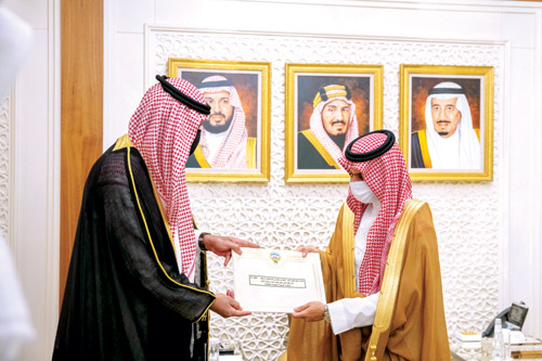 نيابة عن صاحب السمو الملكي الأمير محمد بن سلمان بن عبدالعزيز ولي العهد نائب رئيس مجلس الوزراء وزير الدفاع -حفظه الله-، تسلم صاحب السمو الأمير فيصل بن فرحان بن عبدالله وزير الخارجية رسالتين خطيتين، من صاحب السمو الشيخ مشعل الأحمد الجابر الصباح ولي عهد دولة الكويت، ونائب رئيس مجلس الوزراء وزير الدفاع بدولة الكويت الشيخ حمد جابر العلي، جاء ذلك خلال استقبال سمو وزير الخارجية، في مقر الوزارة بالرياض أمس، الشيخ علي الخالد الجابر الصباح سفير دولة الكويت لدى المملكة.