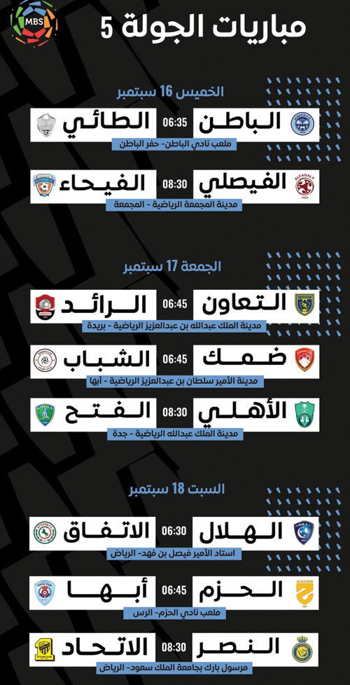 الجولة الخامسة من دوري كأس الأمير محمد بن سلمان للمحترفين التي ستشهد عودة الهلال والنصر بعد فراغهما من المشاركة بدوري أبطال آسيا تفتتح اليوم الخميس بلقاءين هامين يلتقي فيهما الباطن مع الطائي فيما ستكون المواجهة الثانية محتدمة وتجمع الفيصلي بالفيحاء.