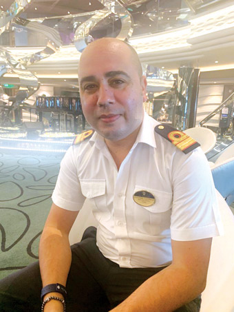 * الكابتن أسامة القرمازي.. مسؤول النزلاء وخدمات الباخرة: أنا سعيد أ، أعمل على هذه الباخرة وأنا أعمل في المملكة.. الشيء الآخر أهنئ المملكة بيومهم الوطني وهو يوم نعتز به كعرب، الشيء الثالث السائح السعودي سائح نشيط وحيوي يتفاعل مع الأنشطة والبرامج، وحول جو الباخرة إلى فعاليات عدة وهو محب لكل الفعاليات ويحترم الناس والمجتمعات الأخرى التي على الباخرة، المملكة فكرت تفكيرًا صحيحًا بوجود هذا النوع من السياحة وغالباً جميع الحجوزات (فل) وهناك عوائل كثيرة تعاود الرحلة مرة أخرى معنا لحبهم الاستمتاع بالبحر ووجود أكثر من 70 فعالية ومطاعم عالمية ونحرص على الصحة العامة والنظافة وتوفير أماكن التسوق.
