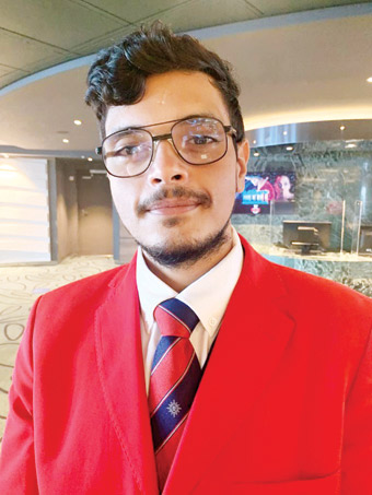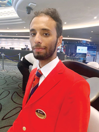 * يزن الغامدي خريج جامعة الملك عبدالعزيز.. علوم فندقة وسياحة: أنا فخور بأنني أمثل بلدي وأعمل على هذه السفينة، وقد سجلنا انطباعًا من أخلاقنا وثقافتنا أمام الجاليات التي تسافر على هذه السفينة، وأنا أعمل 8 ساعات يومياً ومرتاح في عملي وتعرفت على ثقافات المسافرين، وأتمنى أن تتوسع هيئة السياحة في مثل هذا النوع من السفن السياحية لأنه يوجد لدينا شواطئ جميلة والناس عندهم حب للبحر وتلقينا دورات على ظهر هذه السفينة وأفادتنا كثيراً.