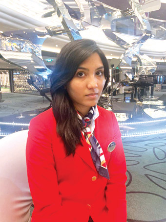 * فاطمة عبدالله العويرضي.. موظفة في إدارة الفعاليات على هذه السفينة، أنا خريجة جامعة الملك عبدالعزيز في تخصص الفندقة والسياحة.. سعادتنا غامرة أن نخدم وطننا في أي مكان وعملنا في البحر جميل جداً، تلقينا خبرة للعمل في هذه السلفينة والعمل فيها ممتع، السائح السعودي نموذج مشرف في أخلاقه وتعامله مع الغير.