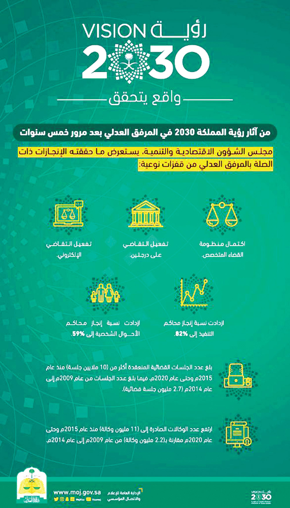 بذلت المملكة منذ تأسيسها على يد الملك عبدالعزيز -طيب الله ثراه- جهوداً عظيمة في سبيل ترسيخ مبدأ العدالة بين الناس بما يحفظ حقوقهم، وذلك عندما وضع الموحِّد -رحمه الله- اللبنة الأولى لتأسيس القضاء قبل حوالي 100 عام بإعلانه إنشاء أول دائرة للقضاء بمكة المكرمة عام 1343هـ قبل أن يصدر أوامره بتشكيل رئاسة القضاء والمكونة من عدد من القضاة والكتّاب في العام الذي يليه، لتستمر بعد ذلك عجلة التطوير والتحديث والتنظيم مروراً بإنشاء وزارة مستقلة للعدل تتولى شؤون القضاء وتشرف على المحاكم وتلبي احتياجاتها والتي باشرت أعمالها في العام 1390هـ، وصولاً إلى هذا العهد الزاهر عهد خادم الحرمين الشريفين الملك سلمان بن عبدالعزيز وولي عهده الأمين صاحب السمو الملكي الأمير محمد بن سلمان بن عبدالعزيز -حفظهما الله- الذي حقق فيه المرفق العدلي خطوات جبارة أصبحت وزارة العدل -بفضلها- أيقونة التطور التقني والعملي والتنظيمي بخطوات وإنجازات تسابق الزمن أسهمت في تقدم مرتبة المملكة في العديد من المؤشرات العالمية، محققة المرتبة 16 عالمياً في مؤشر استقلال القضاء، والمرتبة 19 في تسجيل الملكية العقارية، وغيرها من المؤشرات وذلك في الوقت الذي لم يعد فيه التقاضي الإلكتروني بجميع إجراءاته الخدمة الوحيدة المتاحة -عن بعد- بل إنها واحدة من 125 خدمة إلكترونية تضمها منصة «ناجز» للخدمات العدلية من خلال واقع افتراضي إلكتروني يغني المستفيدين من أفراد ومنشآت عن تكبد المشاق، ويوفر عليهم عناء أكثر من 25 مليون زيارة للمرافق العدلية هي معدل مراجعاتهم السنوية.