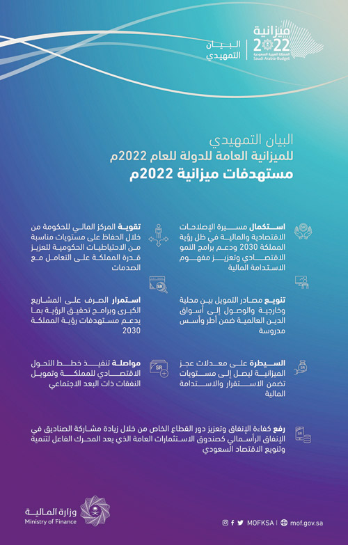 يُذكر أن البيان التمهيدي يُعد أحد عناصر سياسة الحكومة في استمرار تطوير منهجية إعداد الميزانية العامة، ووضعها في إطار مالي واقتصادي شامل على المدى المتوسط، وتعزيز الشفافية والإصلاح المالي ومفاهيم المشاركة، والتخطيط المالي لعدة أعوام، ويهدف البيان إلى إطلاع المواطنين والمهتمين والمحللين على تطورات أداء المالية العامة خلال العام 2021م، وأهم المستهدفات المالية وتقديرات المؤشرات الاقتصادية لعام 2022م وعلى المدى المتوسط، إضافة إلى استعراض المبادرات والبرامج المخطط تنفيذها خلال العام المالي القادم في إطار مستهدفات رؤية المملكة 2030، كما تجدر الإشارة إلى أن الميزانية عادة ما تُعتمد في شهر ديسمبر من كل عام، وقد تتضمن تعديلات على ما ورد في هذا البيان التمهيدي في ضوء ما قد يستجد من تطورات مالية واقتصادية.