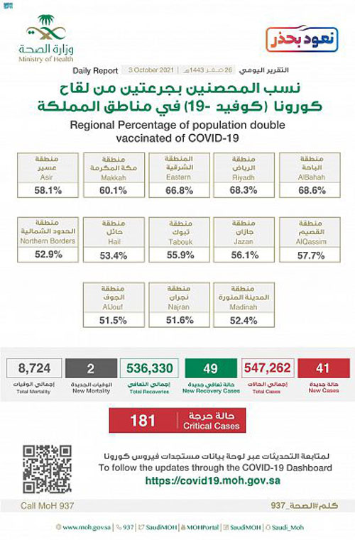 وأضاف أن النسب شهدت تزايداً خلال الأسبوع المنصرم، وأن هناك 3 مناطق شهدت تجاوز الـ 65% ممن أخذوا الجرعتين وهي الباحة والرياض والشرقية، مهيباً بالجميع إلى المبادرة والمسارعة لأخذ الجرعتين، مشيراً إلى أن الدراسات والوضع الحالي يؤكد أن الحالات التي تسجل إصابتها بالفيروس ومنها ما يستدعي الدخول إلى العناية المركزة هي للأشخاص الذين لم يستكملوا الجرعتين.