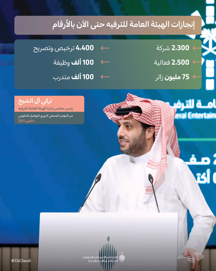 من جهته رفع معالي المستشار في الديوان الملكي رئيس مجلس إدارة الهيئة العامة للترفيه الشكر لخادم الحرمين الشريفين ولسمو ولي العهد على الدعم غير المحدود لقطاع الترفيه، مستعرضا إنجازات هيئة الترفيه حتى الآن، إذ تجاوز عدد الشركات المشاركة والمنظمة في المواسم والفعاليات 2300 شركة، والفعاليات 2500 فعالية، كما تجاوز عدد الزوار 75 مليون زائر، فيما بلغ عدد التراخيص 4400 ترخيص، وعدد الوظائف المباشرة 100 ألف وظيفة، وأخيراً بلغ عدد المتدربين 100 ألف متدرب، مشيرا إلى وجود 9 أنواع مختلفة من التراخيص، و6 برامج متنوعة لتطوير الكوادر البشرية، وإتاحة حلول تمويلية لتحفيز الاستثمار. وأعلن معاليه انطلاق موسم الرياض في النسخة الثانية في تاريخ 20 أكتوبر القادم، لافتا إلى وجود 14 منطقة للترفيه خلال هذا الموسم، وأكثر من 7500 فعالية، و10 معارض عالمية، و350 عرضا مسرحيا عربيا وعالميا، وبطولة للألعاب الإلكترونية، و100 تجربة تفاعلية، و18 مسرحية عربية، و6 مسرحيات عالمية، ومعارض ومزادات لسيارات عالمية، و6 حفلات غنائية عالمية، و70 مقهى، و200 مطعم منها 10 مطاعم عالمية لأول مرة بالمملكة، وأكثر من 30 طن ألعاب نارية، وحفل مصارعة حرة، وأكثر من 76 حفلة غنائية عربية، ومباراتين كرة قدم عالمية. وقال : «إن من الأهداف الرئيسية التي خطط لها سمو ولي العهد أن تكون الرياض عاصمة كبيرة يتجاوز سكانها الـ 15 مليونا»، مشيرًا إلى ديمومة فعاليات الترفيه والسياحة في العاصمة، باستمرار منطقتي «بوليفارد رياض سيتي» و»فيا رياض» طوال العام. وأكد تنافسية أسعار التذاكر في فعاليات وأنشطة موسم الرياض بفارق يصل إلى 40% عن المنطقة وباقي دول العالم، إضافة إلى وجود 4 مناطق مجانية الدخول. وعن تنوع الفعاليات، أوضح آل الشيخ أن الحفلات الغنائية لا تتجاوز 2% من إجمالي فعاليات الموسم، مشيرًا إلى تخصيص العديد من المناطق والمسارح لاكتشاف وتطوير المواهب السعودية، مؤكدًا أن الهيئة قطعت 30% من الهدف المخصص لها قبل 2030.