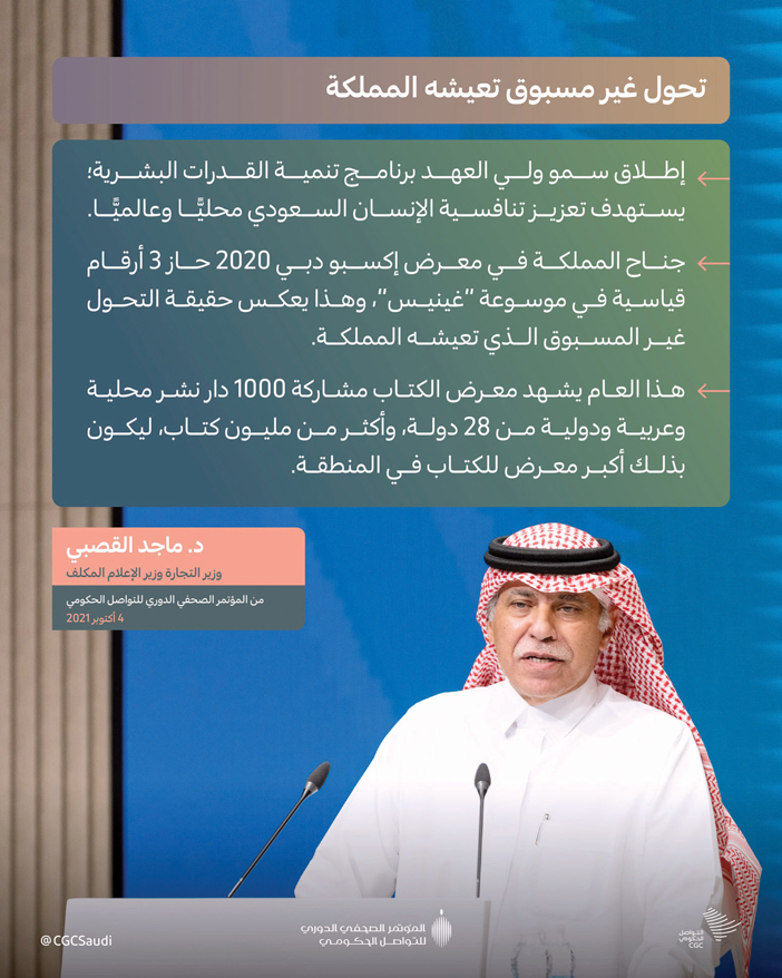 عُقد في الرياض أمس المؤتمر الصحفي الدوري للتواصل الحكومي بمشاركة كل من معالي وزير الإعلام المكلّف الدكتور ماجد القصبي، ومعالي المستشار في الديوان الملكي رئيس مجلس إدارة الهيئة العامة للترفيه الأستاذ تركي آل الشيخ. وأشاد معالي وزير الإعلام بتفاعل المواطنين باليوم الوطني الذي يعكس مشاعر الحب والانتماء، سائلاً الله عز وجل أن يديم عز الوطن ونعمتي الأمن والأمان. وأشار إلى إعلان منظمة الصحة العالمية تحقيق المملكة المرتبة الـ 10 من بين 184 دولة في مؤشر كوفيد العالمي، مقدمًا شكره لكل العاملين في القطاع الصحي وجميع من أسهم من الجهات في تحقيق هذا الإنجاز، منوهًا بما حققته المملكة من إنجاز فريد على مستوى العالم بتحقيقها للمركز الثاني من بين دول مجموعة العشرين في مؤشر النهضة الرقمية، مقدمًا شكره للعاملين والممكنين في القطاعين العام والخاص والشركات الوطنية. وعرج معاليه على جزيرة الآثار والطيور والغزلان «فرسان» بانضمامها كأول محمية سعودية إلى شبكة برنامج الإنسان والمحيط الحيوي في منظمة اليونيسكو العالمية. كما أشار إلى تحقيق الصادرات غير النفطية بفضل الله أعلى رقم في تاريخها وهو 255 ملياراً للفترة من يونيو 2020 حتى يونيو 2021 وهو ترجمة عملية واقعية لمستهدفات رؤية المملكة 2030. فيما نوه معالي الدكتور القصبي بإطلاق سمو ولي العهد -حفظه الله- برنامج تنمية القدرات البشرية الذي يستهدف تعزيز تنافسية المواطن محليًا وعالميًا، كما تناول استراتيجية تطوير عسير «القمم والشيم» بلد الطبيعة والتراث والأصالة، التي أطلقها سمو ولي العهد لتعزيز مكانة المنطقة كوجهة سياحية عالمية على مدار العام.