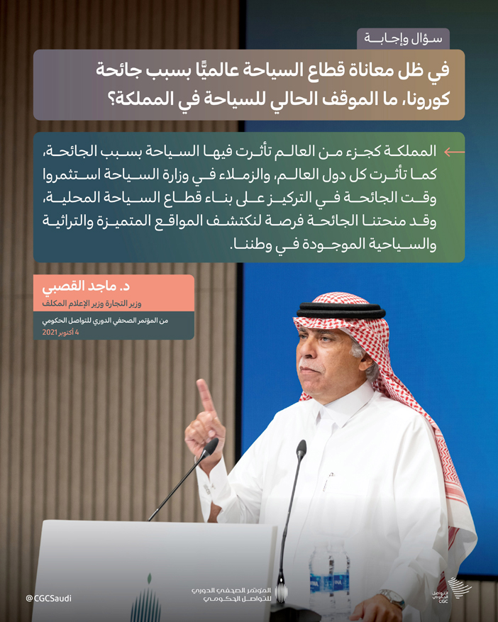 وعن القطاع السياحي في المملكة أكد معاليه أن القطاع هو الموظف الأول لأبناء وبنات المملكة، حيث وهب الله المملكة مزيجا من البحر والجبل والسهل والوادي والصحراء وأهلها المضيافين، مبينا أن أهمية القطاع في المملكة لكونه قطاعا واعداً، لافتا إلى أن وزارة السياحة استثمرت فترة الجائحة في بناء البنية التحتية والمعلوماتية والخدمية، واستكمال جاهزية القطاع لاستقبال السياح. وحول التستر التجاري، قال معاليه: «التستر سرطان ينهش في اقتصاد المملكة منذ عقود بتضييع الفرص أمام أبناء وبنات الوطن»، مشيرًا إلى جدية الدولة في محاربة التستر، لافتا الانتباه إلى توجيه سمو ولي العهد بتشكيل لجنة برنامج مكافحة التستر بمشاركة 20 جهة لمحاربته، وتغليظ وتحديث العقوبات والنظام بوصولها للسجن 5 سنوات، والغرامة إلى 5 ملايين، وتحديث أنواع الرقابة بتحليل البيانات ومتابعة الأموال ومراقبة العاملين والحركة الاقتصادية باستخدام الذكاء الاصطناعي.