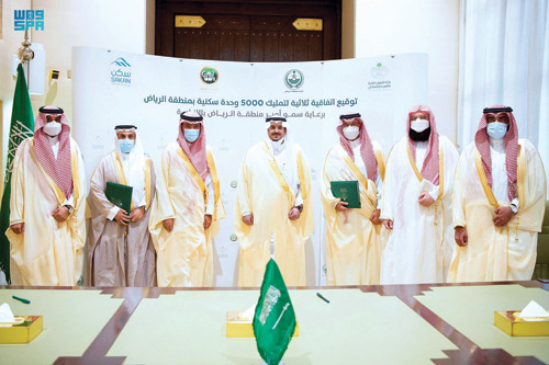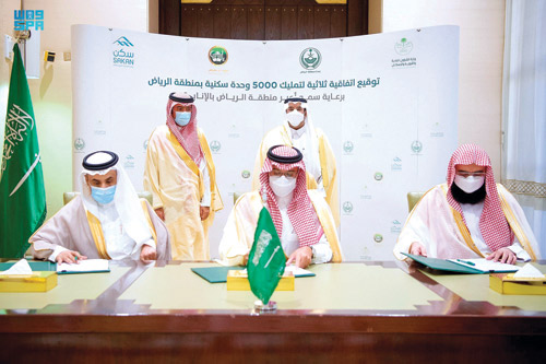 رعى صاحب السمو الملكي الأمير محمد بن عبد الرحمن بن عبد العزيز أمير منطقة الرياض بالنيابة في قصر الحكم أمس، توقيع اتفاقيات لوزارة الشؤون البلدية والقروية والإسكان مع مؤسسة الإسكان التنموي الأهلية «سكن» وجمعية البر الأهلية بالرياض لتوفير 5000 وحدة سكنية جديدة للأسر الأشد حاجة بقيمة إجمالية 1.62 مليار ريال، بحضور معالي وزير الشؤون البلدية والقروية والإسكان ماجد بن عبد الله الحقيل.