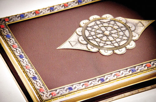 - النسخة مزيّنة بغلاف مذهب مصنوع يدوياً من الذهب الخالص عيار 24 والأحجار الكريمة لإبراز قيمة وجمال المخطوطة الأصلية.