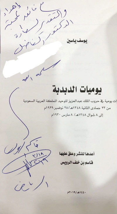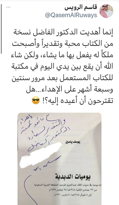 وأضاف على الرغم من عدم توقعي أن أجد هذه النسخة بالذّات في (الكتاب المستعمل) لأن المُهْدَى إليه «شخصية ثقافية وأستاذ جامعي» والكتاب من الكتب التاريخية، المهمة، إلا أنني عندما فكرت بواقعية وجدت أنها هدية انتقلت إلى مُلكِه؛ وله الحق أن يصنع بها ما يشاء سواءً باقتناء أو إهداء، أو بيع، فلماذا الضيق بوجوده في المستعمل؟!