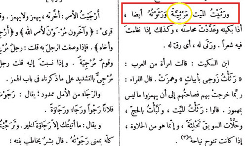 انظر اللسان لابن منظور، والقاموس المحيط للفِيروزابادي (ر ث ي).