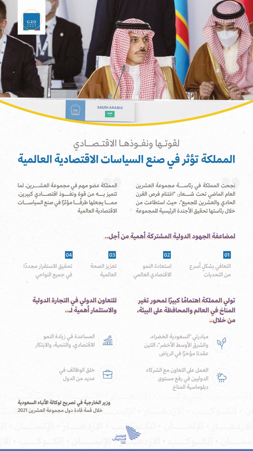 أشاد صاحب السمو الأمير فيصل بن فرحان بن عبدالله وزير الخارجية، بجهود الجمهورية الإيطالية وما حققته خلال رئاستها لأعمال مجموعة العشرين 2021م، ومواصلتها العمل الذي انطلق من المملكة العام الماضي لدعم جهود المجموعة في تحقيق التعاون الدولي في مواجهة التحديات العالمية. كما عبّر سمو وزير الخارجية في تصريح لوكالة الأنباء السعودية، عن أهمية وجود المملكة كعضو في مجموعة العشرين، لما تتميز به من قوةٍ ونفوذٍ اقتصادي كبير، يجعلها طرفاً مؤثراً في صنع السياسات الاقتصادية العالمية. وأشار سموه إلى النجاح الذي حققته المملكة في رئاسة مجموعة العشرين العام الماضي تحت شعار «اغتنام فرص القرن الحادي والعشرين للجميع»، حيث استطاعت المملكة من خلال رئاستها تحقيق الأجندة الرئيسية للمجموعة، والحصول على موافقة المجموعة على العديد من المبادرات لدعم الاقتصاد العالمي في مواجهة جائحة كورونا، والمحافظة على صحة الإنسان، وتعليق الديون، بالإضافة إلى مكاسب عديدة أخرى، مؤكداً سموه أن مشاركة المملكة هذا العام خلال الرئاسة الإيطالية تُعَّد استكمالاً لخارطة طريق العمل الجماعي المشترك الذي تقوم به جميع الدول الأعضاء. وشدد سمو وزير الخارجية على الاهتمام الدولي بالتعاون متعدد الأطراف للوصول إلى أهداف التنمية المستدامة من خلال المنتديات العالمية مثل مجموعة العشرين، بالإضافة إلى مضاعفة الجهود الدولية المشتركة للتعافي بشكلٍ أسرع من التحديات التي تواجهنا، واستعادة النمو الاقتصادي العالمي، وتعزيز الصحة العالمية، وتحقيق الاستقرار مجدداً في كافة نواحي الحياة. كما أشار سموه إلى أهمية التعاون الدولي في التجارة الدولية والاستثمار، للمساعدة في زيادة النمو الاقتصادي، والتنمية، والابتكار، وخلق الوظائف في العديد من الدول. كما أكّد سموه على أهمية معالجة التغير المناخي في العالم والحفاظ على البيئة، مشيراً إلى ما توليه المملكة من اهتمامٍ كبير لهذا المحور، والذي يظهر جلياً في مبادرات «السعودية الخضراء، والشرق الأوسط الأخضر» التي أطلقها صاحب السمو الملكي الأمير محمد بن سلمان بن عبدالعزيز ولي العهد نائب رئيس مجلس الوزراء وزير الدفاع -حفظه الله-، بالإضافة إلى مخرجات قمة مبادرة الشرق الأوسط الأخضر، التي عُقدت مؤخراً في العاصمة الرياض، والتي تم العمل من خلالها على التعاون مع شركائنا الدوليين في رفع مستوى العمل المشترك في دبلوماسيةلمناخ. كما أشار سموه إلى إسهام مجموعة العشرين هذا العام من خلال الرئاسة الإيطالية التي ناقشت البشرية والكوكب والازدهار، في تحقيق المستهدفات العالمية ودفع عجلة الازدهار في كافة دول العالم والحفاظ على الإنسان والكوكب والبيئة بما يحقق تطلعات شعوبنا. كما عبّر سموه عن أهـمية اتخاذ الخطوات اللازمة وتكثيف الجهود الدولية من أجل توفير غذاءٍ آمن وكافٍ لجميع الدول في العالم، ووضع آليات أسرع لتكّيف الزراعة وأنظمة الغذاء لتغير المناخ، وزيادة الاستثمارات المحفزة للأمن الغذائي والأنظمة الغذائية المستدامة والتنمية الإقليمية.