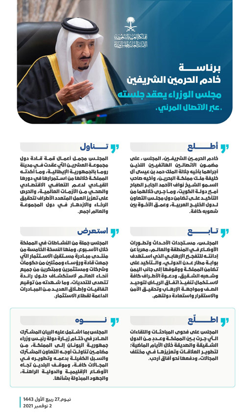 وتناول المجلس إثر ذلك، مجمل أعمال قمة قادة دول مجموعة العشرين التي عقدت في مدينة روما بالجمهورية الإيطالية، وما أكدته المملكة خلالها من استمرارها في دورها القيادي لدعم التعافي الاقتصادي والصحي من الأزمات العالمية، والحرص على تعزيز العمل المتعدد الأطراف لتحقيق الرخاء والازدهار في دول المجموعة والعالم أجمع.