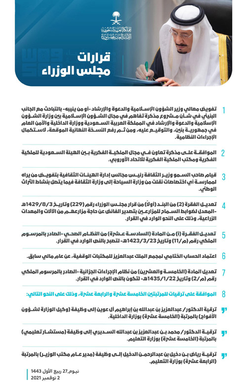 ترقية رياض بن دخيل بن عبدالرحمن الدخيل إلى وظيفة (مدير عام مكتب الوزير) بالمرتبة (الرابعة عشرة) بوزارة التعليم.
