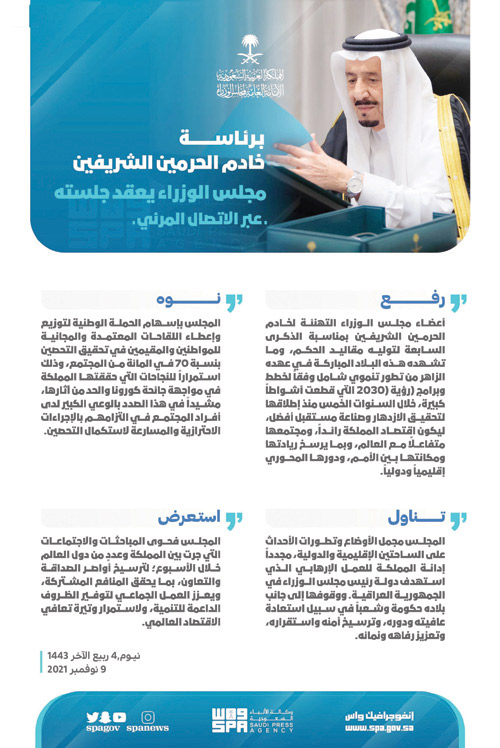 وفي الشأن المحلي، نوّه المجلس بإسهام الحملة الوطنية لتوزيع وإعطاء اللقاحات المعتمدة والمجانية للمواطنين والمقيمين في تحقيق التحصين بنسبة 70 في المائة من المجتمع، وذلك استمراراً للنجاحات التي حققتها المملكة في مواجهة جائحة كورونا والحد من آثارها، مشيداً في هذا الصدد بالوعي الكبير لدى أفراد المجتمع في التزامهم بالإجراءات الاحترازية والمسارعة لاستكمال التحصين.