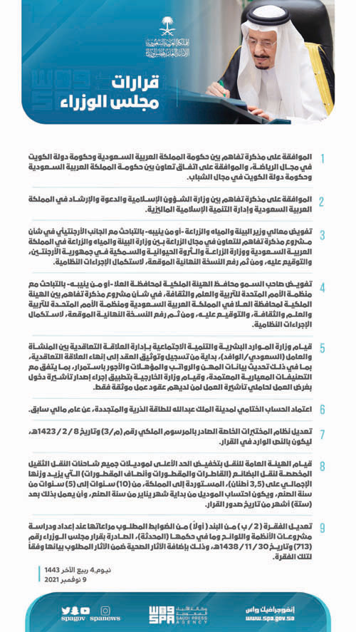 أولاً: الموافقة على مذكرة تفاهم بين حكومة المملكة العربية السعودية وحكومة دولة الكويت في مجال الرياضة، والموافقة على اتفاق تعاون بين حكومة المملكة العربية السعودية وحكومة دولة الكويت في مجال الشباب.