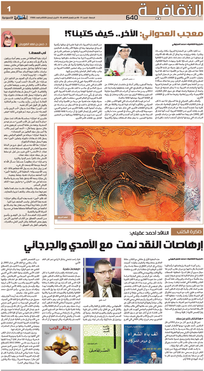 إذا ذكرت الثقافة وخدمة الفن لا ننسى دور جريدة الجزيرة وخاصة في المجلة الثقافية ومساهمتها الفاعلة في إبراز أعمال الفنان التشكيلي والكاتب والشاعر لتحرص على الوصول المتخصص والمتميز إلى المتلقي للثقافة بأنواعها في قالب صحفي ومرئي من خلال الحرف واللون كل الشكر والتقدير لكم على العشرين عاماً من الإبداع ووصولنا للعدد الـ700 من التميز والتألق متمنياً مزيداً من النجاح والتطور وأن يستمر العطاء والإبداع.