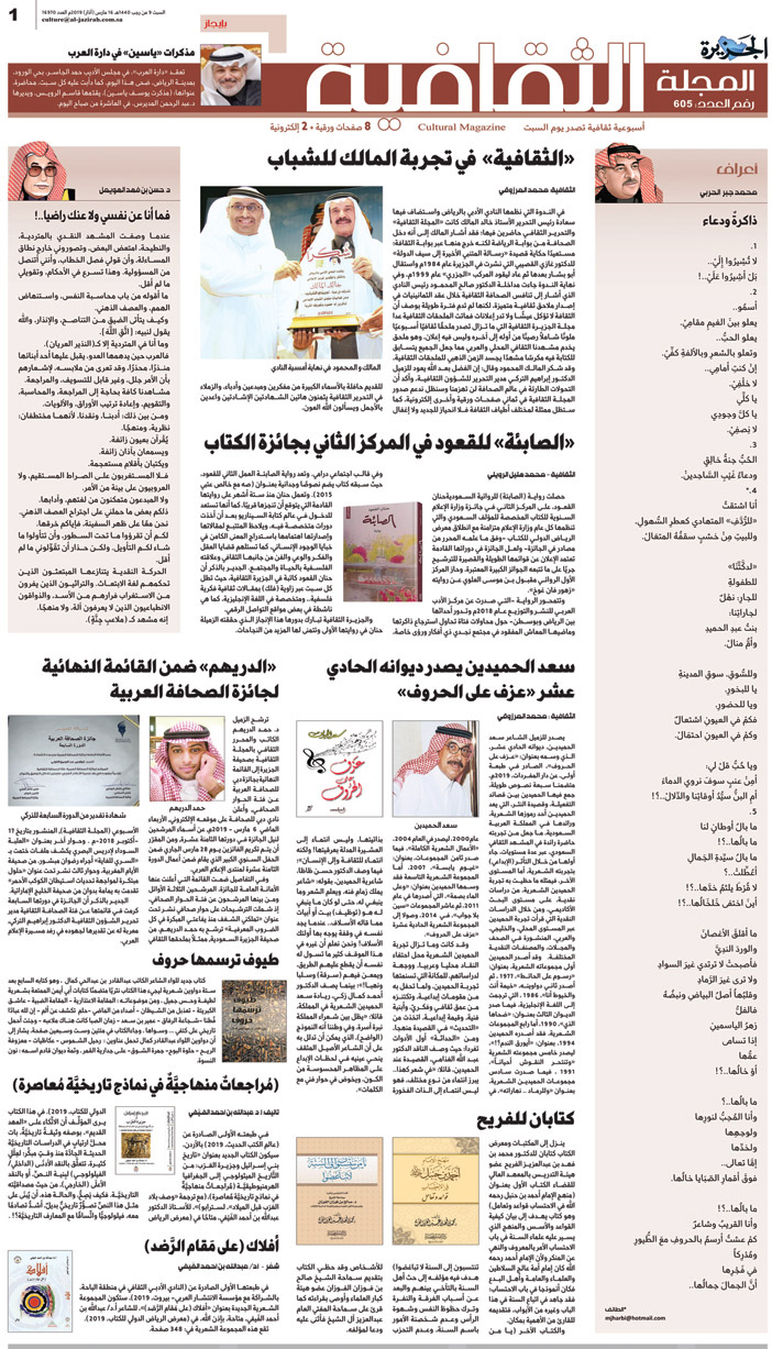 كلنا فرحون باستمرار المجلة الثقافية ووصولها العدد السبعمائة وعقبال تخطي المئات القادمة إن شاء الله، نحن قراءها المتابعون لها والمثابرون على قراءتها نتوقف كثيراً أمام ما يكتب بها من مواضيع شاملة فروع الأدب من فلسفة وشعر ونقد ومقال وحوارات ثقافية ممتعة واستطلاعات عن مواضيع أدبية، يضاف إلى ذلك كله حرصها على رواد ورموز الأدب في وطننا وتقديم الشكر لهم على طريقتها الخاصة الجميلة.