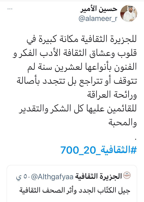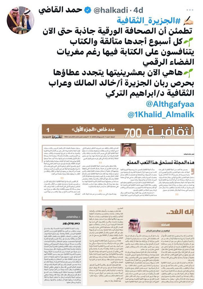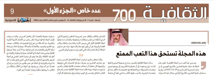 وكتب عضو مجمع اللغة العربية في القاهرة .سابقاً : مدير عام إذاعة الرياض ووكيل وزارة الإعلام ومدير عام وكالة الأنباء السعودية، وعضو مجلس الشورى وهيئة حقوق الإنسان الدكتور (عائض الردادي) : « تهنئة لمجلة «الجزيرة الثقافية «بمناسبة صدور العدد 700، بعد مرور عشرين عامًا على صدورها . عشرون شمعة أضاءت سماء الثقافة، في حين غابت شقيقاتها عن الصدور . تهنئة لأسرة تحريرها، وعلى رأسهم ربانها د. إبراهيم التركي, الذي قاد السفينة من 1- 700 عمرًا مديدًا في مسيرة الثقافية».