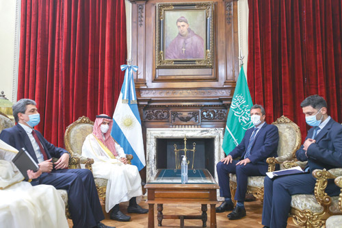 وفي بداية اللقاء جرى استعراض العلاقات الثنائية بين البلدين وسبل تعزيزها في مجالات التعاون المشترك كافة، وأكد سمو وزير الخارجية خلال اللقاء أن المملكة حريصة على تعزيز العلاقات مع جمهورية الأرجنتين، وتكثيف التنسيق المشترك في المجالات السياسية والتنموية والاستثمارية وخاصة في ضوء رؤية المملكة 2030.