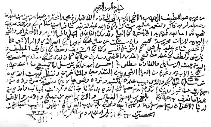 ويُلحظ أنّ رسائل علماء الدرعية الأولى، وعلماء الرياض زمن الشيخين عبد الرحمن بن حسن، وابنه عبد اللطيف؛ نُسخت في الرياض بعد سنة 1340هـ، من خطوط علماء خارج الرياض، وهذا يدلّ على خلوّ الرياض منها ووجود الحاجة إليها، ويظهر لمتتبّع رسائل الشيخ محمد بن عبد اللطيف (ت:1367هـ)؛ أنّه أدرك أهمية الجمع، وسعى فيه، فقد كتب سنة 1332هـ رسالةً إلى قاضي بلدة أشيقر الشيخ عبد العزيز بن عامر، وقال: (مطلوبنا أحسن الله عملك ترسل لنا جميع ما عند جنابك ... شيخ الإسلام ابن تيمية وغيره من العلماء النجديين المتقدمين والمتأخرين ننظر فيهن، والذي عندنا نرسلها لجنابك، والذي مهيب عندنا نكتبه ونردّه، وأنت بارك الله في حياتك الذي بدأتنا بذلك، وعرضت الجانب) [صورة من الرسالة أفادني بها الأستاذ عبد الله البسيمي]، وكتب إلى الشيخ إبراهيم بن صالح بن عيسى سنة 1335هـ المقيم في بلدة أشيقر أيضاً، وطلب منه نسخ بعض الرسائل[(تاريخ ابن عيسى) (1/ 171)، دراسة د. أحمد البسام]، وطلب من الشيخ عبد الله بن حمد الدوسري إعارة بعضها، وكان الشيخ عبد الله في شقراء، وانتقل منها، وكتب وثيقة قال فيها: (الذي عطينا الشيخ محمد بن عبد اللطيف لنا من المسائل ينسخها ويردّها علينا)، وذكر منها ما نسخه الشيخ محمد أبو عباة من أهل بلدة شقراء، وذكر غيرها، وقال: (وسط محفظة لنا أمّ أزرّة، الجميع عارية وينسخها إن شاء الله تعالى)[صورة من الوثيقة أفادني بها د. عبد الله بن زيد المسلّم التميمي]، وكتب الشيخ محمد بن عبد اللطيف وهو في عسير سنة1339هـ رسالةً إلى الشيخ محمد بن عبد الخالق الحفظي التهامي الشافعي، وقال: (إن رأيت شيئاً من رسائل أهل الدرعية فأتحفنا به ننتفع بها مدّة مقامنا، وترجع إليكم)، وكتب في آخر سنة 1339هـ رسالةً إلى الشيخ أحمد بن محمد الحفظي، وقال: (مرامنا المكاتبات والمسائل التي من آل الشيخ ومن حمد بن ناصر بن معمر ومن سعيد بن حجي لأهاليكم، والمجاوبات، مقصودنا ننشرها، وينتفعون بها المسلمون، ويدعون لأهلها، وهي على وقفيّتها، وأنت فاهم أنّ أفرح ما لأمواتكم أننا ننشرها، ولا قصدنا إلا أنّ أهلكم يُدعى لهم، وينتشر ذكرهم وصيتهم، ويجري لهم الثواب)[باختصار، أحمد الحفظي (مراسلات آل الحفظي)، ص98، 102].