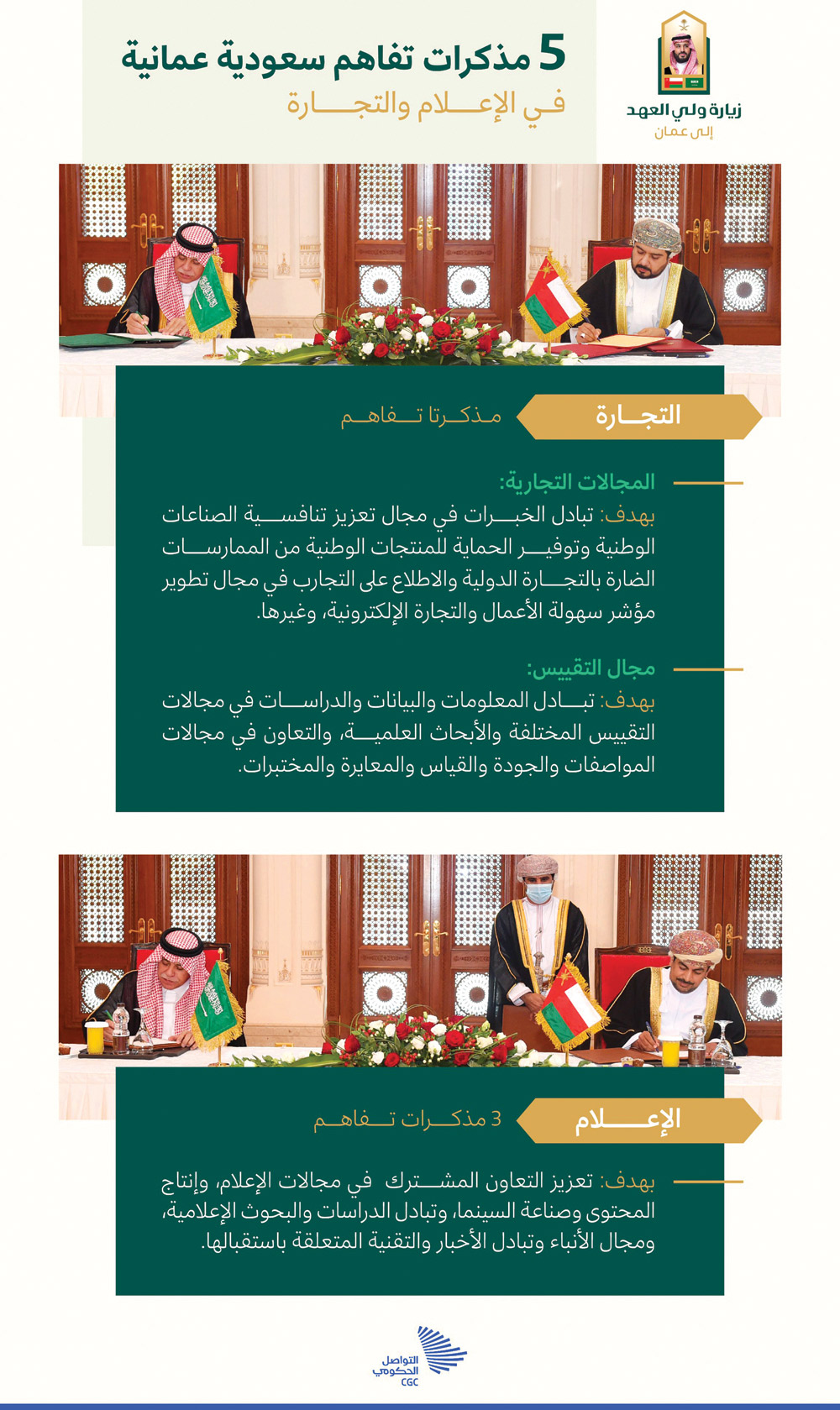 جرى أمس على هامش زيارة صاحب السمو الملكي الأمير محمد بن سلمان بن عبد العزيز، ولي العهد نائب رئيس مجلس الوزراء وزير الدفاع، لسلطنة عُمان التوقيع بين المملكة العربية السعودية وسلطنة عُمان، على خمس مذكرات تفاهم في المجالين التجاري والإعلامي.