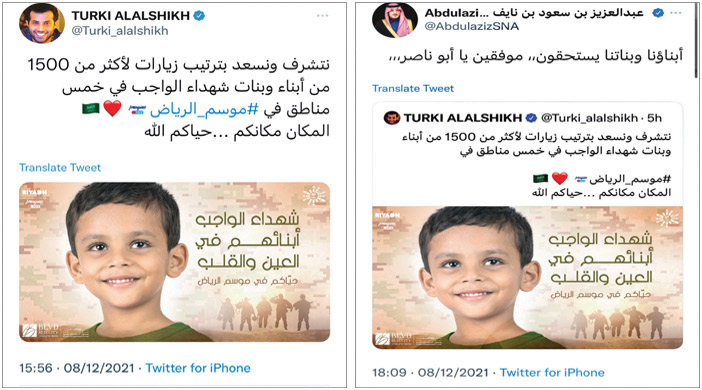 أطلق موسم الرياض 2021 مبادرةً اجتماعيةً جديدةً تهدف إلى إسعاد ذوي الشهداء،وإشراكهم بفعاليات الموسم، من خلال إتاحة الفرصة لهم في الاستمتاع بكل فعاليات موسم الرياض هذا العام. وتعمل «مبادرة ذوي الشهداء» التي أطلقها الموسم على دراسة عدد من الفرص والمبادرات مع الجهات المختصة لتقديم عدد من الخدمات الترفيهية، وإتاحة الفرصة لخيال أكثر لدى ذوي الشهداء الذين بذلوا أرواحهم لحماية الوطن. ويبدأ الموسم في تفعيل «مبادرة ذوي الشهداء» في مناطق بوليفارد رياض سيتي، والرياض ونتر وندرلاند، وشجرة السلام، وقرية زمان، ورياض سفاري، وتشمل الفعاليات التي سيبدأ تطبيق المبادرة منها «سيرك دوسوليه ميسي، وعرض مانا ذا شو». وتأتي المبادرة انطلاقًا من دور موسم الرياض 2021 في القيام بدوره الاجتماعي، إضافةً إلى منجزاته الترفيهية، والاقتصادية، وعدد من المستهدفات التي شملت جوانب مختلفةً من الحياة المجتمعية في جميع مناطق الموسم وفعالياته المتنوعة. وقد نوه صاحب السمو الملكي الأمير عبدالعزيز بن سعود بن نايف وزير الداخلية المبادرة وقال في تغريدة رداً على أخرى تضمنت إعلان معالي رئيس مجلس إدارة الهيئة العامة للترفيه المستشار تركي آل الشيخ ، قال سموه :»أبناؤنا وبناتنا يستحقون .. موفقين يا أبو ناصر».