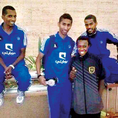 ويحمل قميص الهلال سعود عبد الحميد يوقع عقده ويلتقط صورة سيلفي بقميص الزعيم عبد الحميد في لقطة تذكاريه «أرشيفيه» مع عدد من نجوم الهلال.