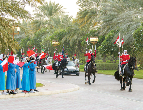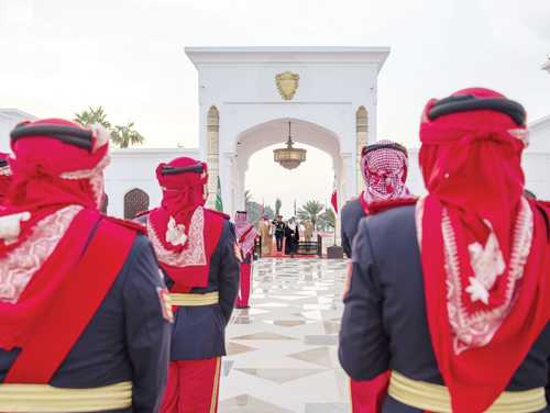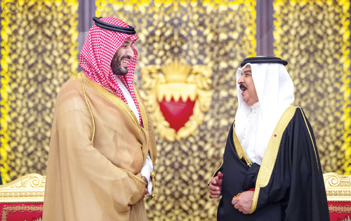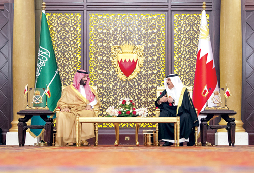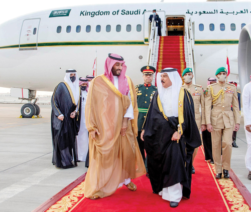 وصل صاحب السمو الملكي الأمير محمد بن سلمان بن عبد العزيز ولي العهد نائب رئيس مجلس الوزراء وزير الدفاع أمس، إلى مملكة البحرين في زيارة رسمية. وكان في استقبال سمو ولي العهد لدى وصوله مطار قاعدة الصخير الجوية، جلالة الملك حمد بن عيسى آل خليفة، ملك مملكة البحرين. كما كان في استقبال سمو ولي العهد، صاحب السمو الملكي الأمير سلمان بن حمد آل خليفة ولي العهد رئيس مجلس الوزراء بمملكة البحرين، وأصحاب السمو الملكي الأمراء وأصحاب المعالي الوزراء في الحكومة البحرينية. وتوجه سمو ولي العهد وجلالة ملك البحرين، في موكب رسمي إلى قصر الصخير، حيث اصطف على جانبي الطريق مجموعة من أبناء البحرين رافعين أعلام المملكتين ومرددين الأناشيد الوطنية السعودية والبحرينية ترحيباً بمقدم سمو ولي العهد. وقد أجريت لسمو ولي العهد، مراسم استقبال رسمية، حيث عزف السلامان الملكيان السعودي والبحريني، ثم استعرض حرس الشرف، فيما أطلقت المدفعية 21 طلقة ترحيبًا بسمو ولي العهد. وفي الصالون الرئيسي بقصر الصخير رحب جلالة ملك البحرين بسمو ولي العهد في زيارته الحالية لمملكة البحرين، فيما عبر سمو ولي العهد عن شكره وتقديره لجلالته على حفاوة الاستقبال وكرم الضيافة. ونقل سمو ولي العهد، تحيات خادم الحرمين الشريفين الملك سلمان بن عبد العزيز آل سعود - حفظه الله - لجلالة ملك البحرين، فيما حمله جلالته تحياته لخادم الحرمين الشريفين. واستعرض سمو ولي العهد مع جلالة ملك البحرين العلاقات الأخوية التاريخية بين البلدين الشقيقين، وسبل تعزيز التعاون في مختلف المجالات، كما جرى تناول تطورات الأوضاع على الساحتين الإقليمية والدولية.