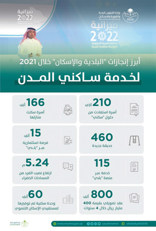 وأوضح الحقيل أن أعمال وزارة الشؤون البلدية والقروية والإسكان ضمن القطاعين البلدي والإسكاني ترتبط بأكثر من 30% من أهداف وبرامج رؤية المملكة 2030 وبما يزيد على 90% من احتياجات سكان المدن لذا خُصص 43% من الميزانية هذا العام للخدمات العامة وذلك امتداداً للدعم المتواصل من خادم الحرمين الشريفين الملك سلمان بن عبدالعزيز آل سعود وسمو ولي عهده الأمين - حفظهما الله-.وأشار إلى أن العام 2021 شهد إنشاء أكثر من 460 حديقة جديدة وزراعة 21 ألفا ليرتفع بذلك نصيب الفرد من الساحات والأماكن الخضراء إلى 5.24م2، وذلك ضمن جهود الوزارة للارتقاء بجودة الحياة في المدن السعودية وتحسين المشهد الحضري داخل المدن لتحقيق مراتب متقدمة في مؤشر تصنيف قابلية العيش العالمي، وإطلاق مبادرة «التنبيه أولا « الذي أسهم في معالجة المخالفات قبل إصدار العقوبات المقررة لنحو 43% من المخالفات البلدية، ممّا رفع حالات الامتثال بالاشتراطات والأنظمة البلدية؛ فيما انخفضت بلاغات الطرق داخل المدن بنسبة 70% وبلاغات الحفريات 61% وشكاوى النظافة العامة بمعدل 41% بعد إنشاء غرفة مركزية لإدارة ملف التشوه البصري وغرف عمليات في جميع الأمانات، وكذلك عن طريق بلاغات السكان على الرقم 940.