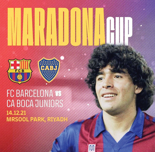 تتجه أنظار عشاق كرة القدم في الثامنة من مساء هذا اليوم نحو ملعب مرسول بارك بجامعة الملك سعود بالرياض لمتابعة المباراة الاستثنائية التي ستجمع فريقي برشلونة وبوكاجونيورز على كأس النجم الإرجنيتيني الأسطورة الراحل دييغو أرماندو مارادونا تخليدا لذكراه، والتي تأتي كحدث كروي غير مسبوق بعد أن أدرجت ضمن موسم الرياض الذي يحظى بإقبال جماهيري كبير.
