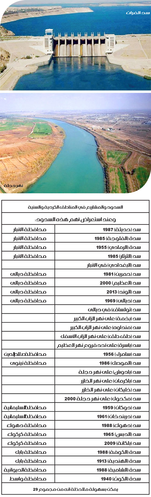 سداً - مقامة او قيد الانشاء - تقع 24 منها في المناطق السنية والكردية في العراق بنسبة تعدت الـ82 في المائة, والباقي يصب في مصلحتها ولا يسمن ولا يغني من جوع تم إنشاؤه قبل او عند قيام الحكم الملكي في العراق. الأمر الذي يعني أن الأنظمة التخزينية في العراق هي أنظمة طائفية كحكومات العراق على مر القرن السابق، وأن الجنوب العراقي كانت مجرد قناة لتصريف مياه البزل المالحة القادمة من الأراضي السنية. حيث تروى الأراضي في محافظة صلاح الدين سيحاً، من خلال نظام اروائي هندسي صنعته الأنظمة, في الوقت الذي يعاني فيه جنوب العراق من تخريب متعمد لأنظمته الزراعية التاريخية التي اوجدتها الطبيعة والانسان السومري.