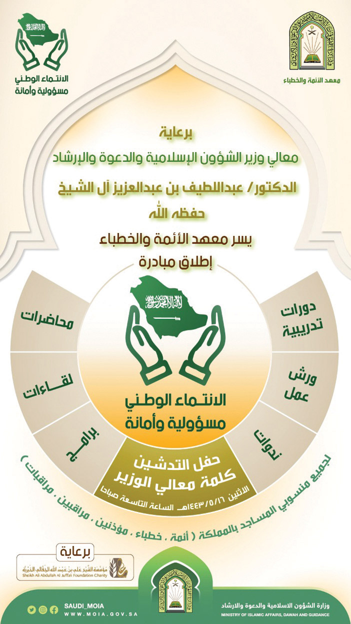 يدشن وزير الشؤون الإسلامية والدعوة والإرشاد الشيخ الدكتور عبداللطيف بن عبدالعزيز آل الشيخ، اليوم، مبادرة «الانتماء الوطني مسؤولية وأمانة» التي ينظمها معهد الأئمة والخطاء لمدة يومين، وتستهدف جميع منسوبي المساجد بمناطق المملكة من أئمة وخطباء ومؤذنين ومراقبين ومراقبات.