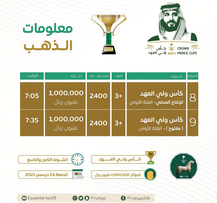 تسعد جماهير الخيل وملاكها وعشاق سباقات السرعة مساء غد الجمعة بمتابعة ثاني أمسياتها الكبرى في النزال المخصص لخيل الإنتاج والمستورد على كأسي سمو ولي العهد في نسختها الـ 56، وهو السباق الكبير الأول والمصنف ضمن الفئة الأولى التي ستجمع صفوى عمالقة الإنتاج وكبار جياد المستورد بالمملكة وسط مشاركة قياسية من الكويت والإمارات.