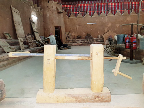 والمحلج عبارة عن آلة يدوية خشبية بسيطة تدار باليد، تفصل بذور القطن عن غزله، وتُصنع محليًا على أيدي النجارين من خشب الأثل، وتتكون من ركبتين من خشب سميك مثبتتين في قاعدة خشبية كبيرة، تدفن تلك القاعدة في الأرض وتثبَّت بالطين، وفي كل ركبة ثقب مستطيل في أعلاه، حجمه حوالي 4×7 سم، وبين الركبتين معراضان من أعواد أسطوانية مستقيمة من الخشب الصلب بسمك حوالي 3 سم وطول ما بين 45-50 سم، كل منهما ينتهي بطرف مربع الشكل يدخل المعراض الأول من الجهة اليمنى ويبقى طرفه المربع بارزاً خارج الركبة حوالي 5 سم وطرفه الآخر على مستوى الركبة الأخرى، ويركب المعراض الآخر من الجهة اليسرى فوقه معاكساً له ويبقى طرف المربع خارج الركبة حوالي ه سم، ويجب أن يتطابق المعراضان تماماً ولا يبقى بينهما أي فراغ، ويحشى المستطيلان في الركبتين بقطن أو قماش حتى يثبتان ويضمنان تطابق المعراضين.