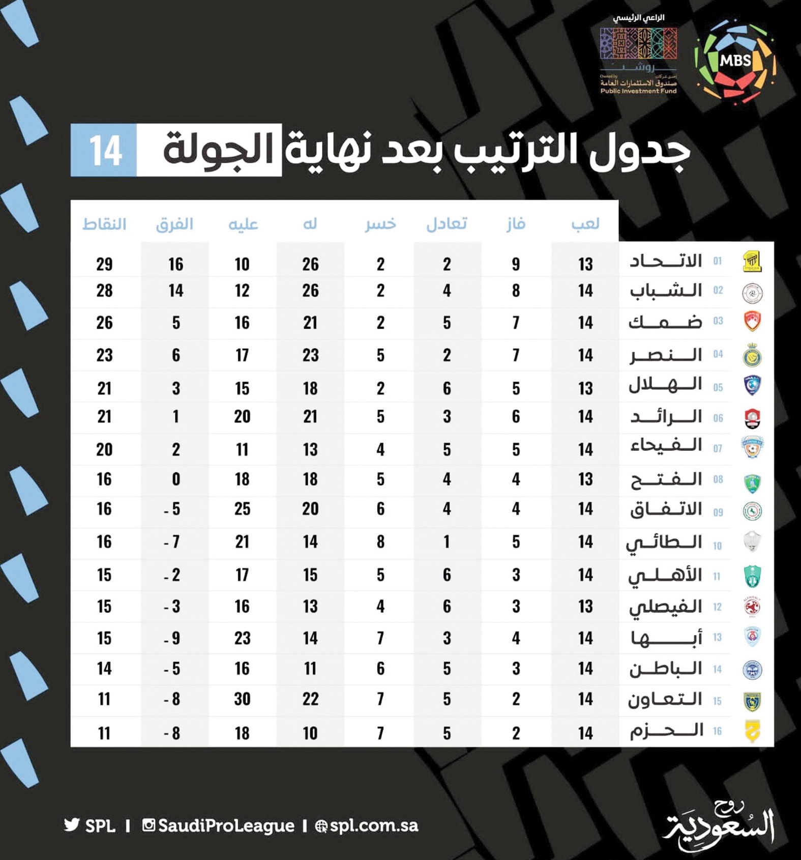 اختتمت أمس الجولة 14 من دوري كأس الأمير محمد بن سلمان للمحترفين .. حيث واصل الشباب انطلاقته وتألقه وهزم التعاون بثلاثية اكدت عزمه على المنافسة الجادة على اللقب .. وفي بريده نال الرائد نصيبه من الأهلي وهزمه بهدف وحيد كان كفيلا بمنح رائد التحدي النقاط الثلاث , وتأكيد تدهور وتواضع الأهلي .