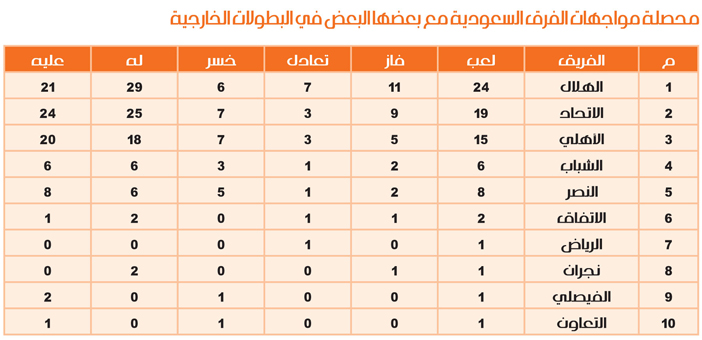 ـ في المواجهات الخارجية يعتبر الهلال الأكثر تسجيلاً بواقع 29 هدفاً، فيما يعتبر الاتحاد الأكثر استقبالاً للأهداف بواقع 24 هدفاً.