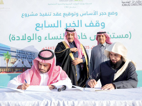 بحضور الأمير عبدالرحمن بن عبدالله بن فيصل محافظ المجمعة والرئيس الفخري لجمعية البر الخيرية بالمجمعة أقامت جمعية البر الخيرية حفل تدشين وتوقيع عقد تنفيذ مشروع وقف الخير السابع والمتمثل في إنشاء مستشفى خاص للنساء والولادة العائد للجمعية والذي يعد الأول من نوعه في المحافظة وذلك مع إحدى الشركات، إضافة إلى توقيع عقد الإشراف الهندسي مع أحد المكاتب الهندسية وفور وصول المحافظ إلى موقع الحفل المقام على أرض المشروع الواقع على شارع الأمير مقرن بن عبدالعزيز قام بازاحة الستار عن اللوحة التذكارية ثم بدأ الحفل الذي حضره مستشار معالي وزير الشؤون البلدية والقروية والإسكان والأمين العام للمجالس البلدية الدكتور يحيى بن عبدالعزيز الحقيل وجمع من أعيان المحافظة ومديري الإدارات الحكومية والأهلية بدأ الحفل بكلمة لرئيس الجمعية الاستاذ توفيق بن محمد العسكر رحب فيها بالمحافظ والحضور وأشار إلى أن مبنى مستشفى النساء والولادة المزمع إقامته يتكون من 5 أدوار بسعة 60 سريرا ومنطقة للعيادات الخارجية بعدد 26 عيادة بالإضافة إلى أقسام متعددة للتنويم والأشعة والعمليات وتبلغ تكلفة إنشائه 60 مليون ريال ومن المتوقع أن يتم الانتهاء من مرحلة بناء العظم خلال 10 أشهر وأضاف أن الجمعية وبدعم كبير من المجتمع والجهات المانحة والتجارية خطت خطوات متسارعة إذ تم تغطية ما يعادل 25 في المائة من التكلفة الإجمالية للوقف وأغلقت المرحلة الأولى من جمع التبرعات في فترة وجيزة وشكر كل الداعمين بمالهم ورأيهم وجهدهم وعلى رأسهم مؤسسة الرميح للمقاولات ممثلة برئيسها طارق بن عبدالله الرميح على تكفلهم بأعمال حفر وتسوية كامل أرض المشروع ومكتب المجاز للاستشارات الهندسية ممثلًا برئيسه المهندس فهد بن عبدالله اليحيى وأهاب بالمحسنين دعم هذا المشروع النوعي لما يمثله من أهمية تنموية وخدمية لمحافظة المجمعة وما جاورها.