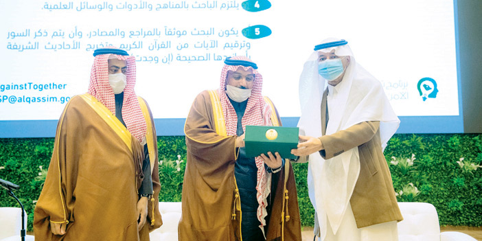 وأشار سمو أمير القصيم إلى أن هناك مهددات لعقيدة الشباب وشابات الوطن ليس بعقيدة الاسلام وإنما تهدد المسلمات والقناعات، عبر عدة وسائل لكي تنقطع السلسلة بين جيل الشباب والاحفاد.