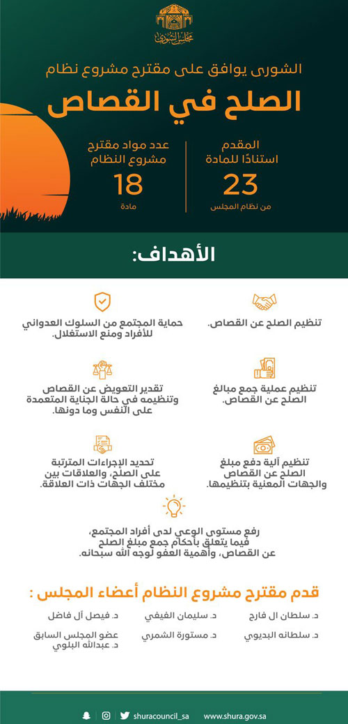 جاء ذلك خلال أعمال جلسته التي عقدها المجلس أمس وينظم مشروع النظام وفقاً لتقرير لجنة الشؤون الإسلامية والقضائية في (18) مادة، عملية جمع مبالغ الصلح عن القصاص، وتقدير التعويض عن القصاص وتنظيمه في حالة الجناية المتعمدة على النفس وما دونها، وتنظيم آلية دفع مبلغ الصلح عن القصاص والجهات المعنية بتنظيمها، وتحديد الإجراءات المترتبة على الصلح، والعلاقات بين مختلف الجهات ذات العلاقة، ورفع مستوى الوعي لدى أفراد المجتمع، فيما يتعلق بأحكام جمع مبلغ الصلح عن القصاص، وأهمية العفو لوجه الله سبحانه.