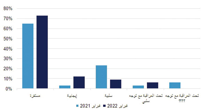 وأضاف، تجاوز عدد الشركات التي أجرينا تغييرات إيجابية على حيثيات تصنيفاتها الائتمانية ونظراتها المستقبلية عدد الشركات التي قمنا بخفض تصنيفاتها الائتمانية في عام 2021، بدعم من زيادة الأرباح ورأس المال. نتوقع أن يتباطأ هذا التوجه في عام 2022، نظراً لبعض الضغوط على الأرباح.