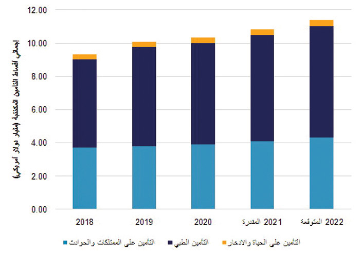 وحافظ السوق السعودي على معدل نمو إجمالي أقساط التأمين عند نحو 5 في المائة في 2021. توقع أن يظل المعدل في هذا النطاق في عام 2022، بدعم من التعافي الاقتصادي المتوقع في المملكة وبدعم أكبر من برنامج التأمين الطبي للحجاج والمعتمرين والتغطيات الجديدة مثل التأمين على العيوب الخفية.