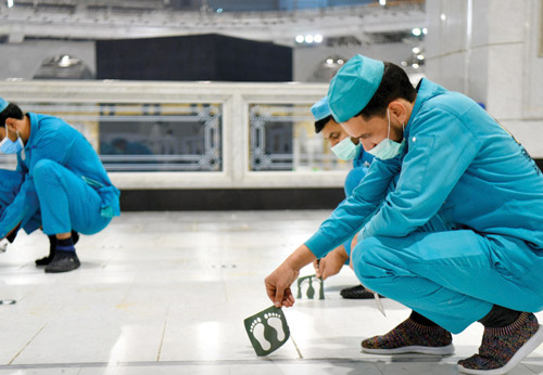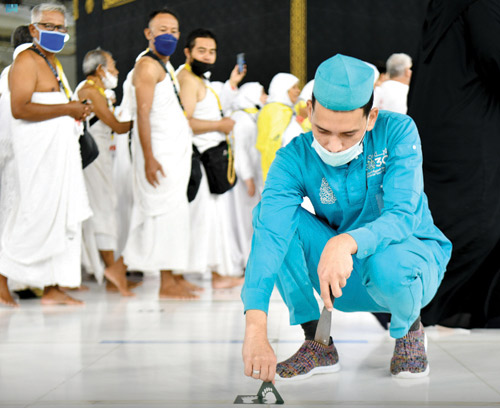 قامت الرئاسة العامة لشؤون المسجد الحرام والمسجد النبوي بإزالة ملصقات التباعد الجسدي داخل المسجد الحرام التي اعتمدتها الرئاسة مع بداية جائحة فايروس كورونا، وذلك بعد قرار رفع الإجراءات الاحترازية والوقائية المتعلقة بمكافحة الجائحة وإيقاف تطبيق إجراءات التباعد في المسجد الحرام والمسجد النبوي الشريف والجوامع والمساجد، مع الاستمرار بالإلزام بلبس الكمامات. وعملت الرئاسة منذ بداية الجائحة على تطبيق عدد من الإجراءات والتدابير الوقائية للحفاظ على سلامة قاصدي المسجد الحرام ومن أهمها ملصقات التباعد الجسدي التي وزعت في كل أرجاء البيت الحرام، حيث تم في البداية اعتماد الملصقات على بعد مترين ثم مع منتصف المرحلة الثالثة تم تقليصها إلى المتر ونصف المتر. وأسهمت الملصقات بشكل كبير في إنجاح عمليات إدارة التفويج والحشود داخل المسجد الحرام، وذلك من خلال الممرات ومسارات المطاف والسعي والمصليات وغيرها من الأمور التي استحدثتها الرئاسة للحفاظ على سلامة قاصدي ومرتادي البيت الحرام.