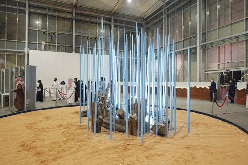 ولفتت تفاصيل المجسم الذي استقبل زوار البوابة الثالثة لمعرض العطور انتباههم، حيث يصوّر المجسم مشهد احتراق العود الأزرق أحد أفضل وأرقى أنواع العود لدى العرب، ويعكس التصميم صورة الدخان الذي ينتج عند احتراق خشب العود الأزرق، ويمثّل المجسم أيقونة الدخول إلى أجنحة العطور الشرقية ذات روائح البخور والعود.