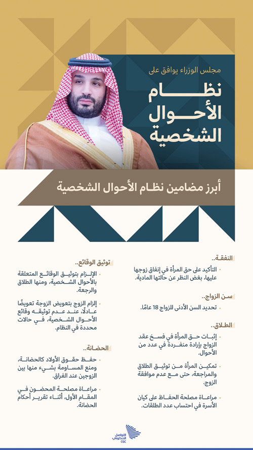 صرح صاحب السمو الملكي الأمير محمد بن سلمان بن عبدالعزيز ولي العهد نائب رئيس مجلس الوزراء -حفظه الله- بمناسبة موافقة مجلس الوزراء على نظام الأحوال الشخصية، بعد استكمال الإجراءات النظامية لدراسته في مجلس الشورى، وفقاً لما يقضي به نظامه، أن نظام الأحوال الشخصية هو ثاني مشروعات منظومة التشريعات
